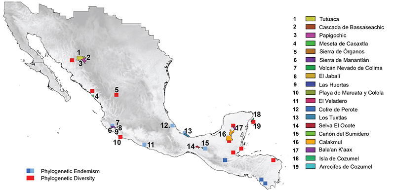 En un contexto espacial estimamos índices de endemismo, de diversidad filogenética y endemismo filogenético en México, considerando las plantas vasculares mexicanas así como grupos funcionales como geofitas o de ciertas regiones biogeográficas, biomas o grupos como las Orchidaceae. Estos índices nos permiten identificar regiones y grupos de plantas importantes para preservar, así como entender como se ha originado la flora mexicana.